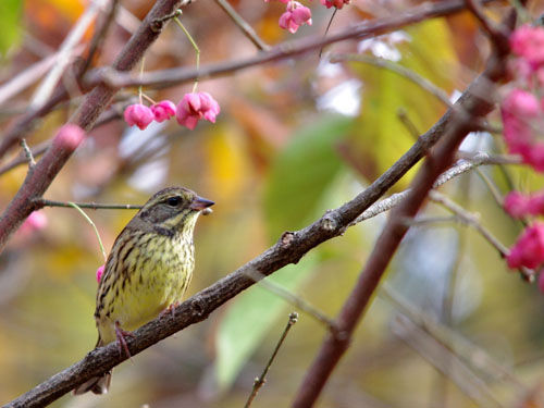 整理番号:004a 撮影日時:2011年11月 撮影場所:このアオジのそばにある桃色の花はマユミ。震災後廃校となった北里大学の近くで撮影。