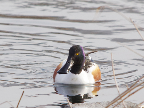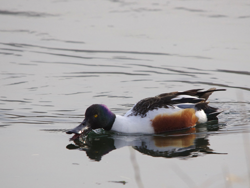 シャモジのような幅広のくちばしをもつカモ。 全国的に広く冬に飛来するがケセン地方ではあまり見ることはないようです。 この写真は盛川で一羽だけで餌を探していた時のものです。 たぶん仲間と共に目的地に向かっている際、はぐれてしまい羽を休めていたのでしょう。 ヘラのような口ばしだけでなく羽色も美しい水鳥です。
