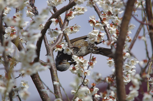 全体に暗い灰色で、ぼさぼさ頭と頬に赤茶色の斑が特徴です。 町中から山奥までどこにでも現われますので野鳥に詳しくなくてもヒヨドリは 知っているという方も多いと思います。昆虫に加え花の蜜も好みますし 畑の野菜なども食べるので農家の嫌われ者になっています。以外に警戒心が強く 人が近づくこと騒ぎたてながら飛び去ります。