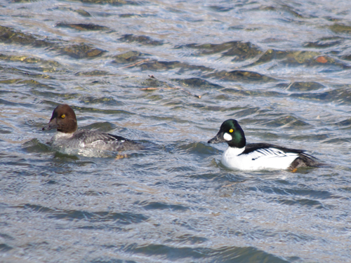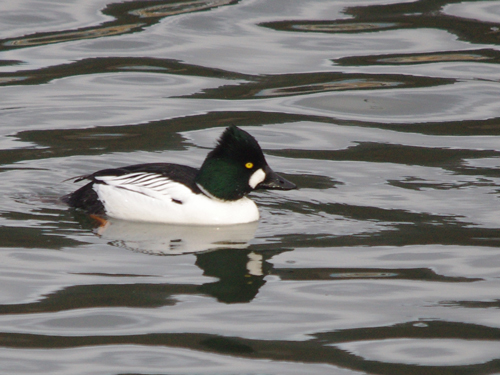 オスの頬に丸い真っ白な模様があるので覚えやすいカモでしょう。頭は緑色の三角おにぎりのような 形をしているのでユーモラスなカモでもあります。さらに目は黄色く体は白い羽色なので美しい カモでもあります。メスは御多分に漏れず地味です。オスとメスがいつも一緒で仲が良く微笑ましくもあります。