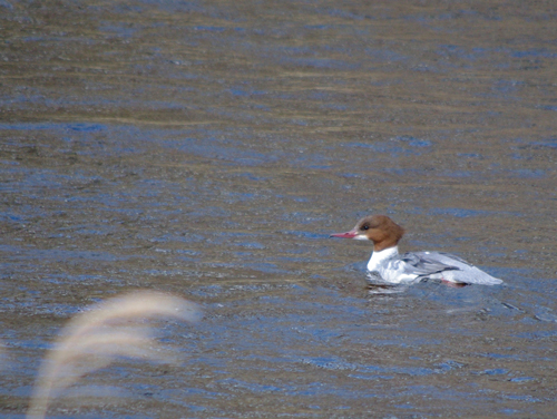 観察時期:秋冬春 観察場所:湖沼、河川、港湾 鳴き声:クッ クッ クッ けせん地方には冬鳥として飛来する美しいカモ類です。 雄は頭部が玉虫色の緑で口ばしと脚部が真っ赤で美しい。 雌は頭部が茶色で口ばしと脚部がピンク色と少し控え目な美しさです。 ウミアイサとの違いですがウミアイサの頭はボサボサですがカワアイサの頭は ポマードで、なでつけたようにピタッとしています。