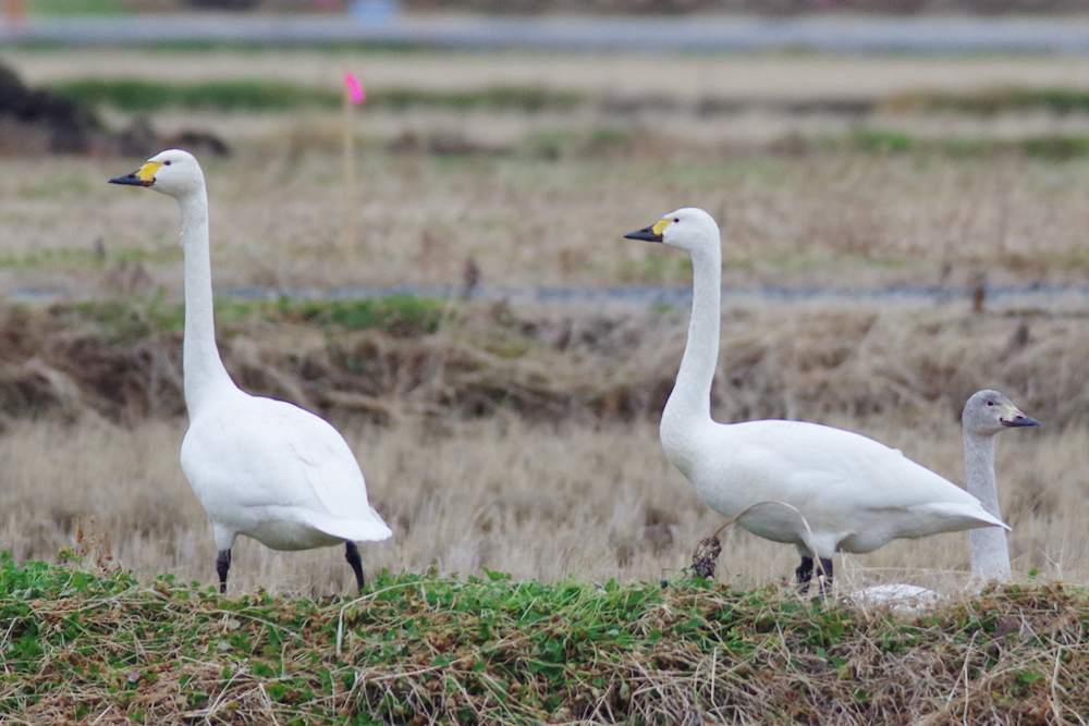ケセンで飛来する白鳥の多くはオオハクチョウのようです。 今までコハクチョウは見たことがありませんでした。口ばしの 黄色と黒が半々位が特徴です。白が成鳥で灰色は今年生まれの幼鳥です。