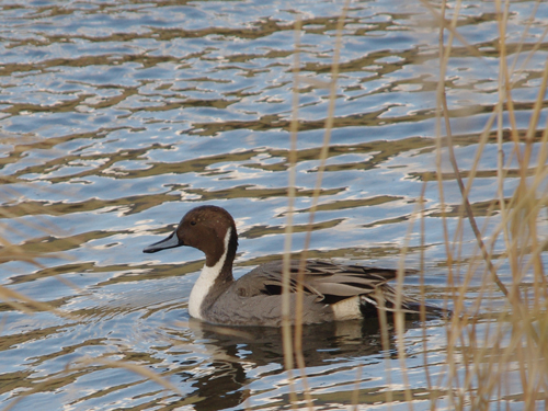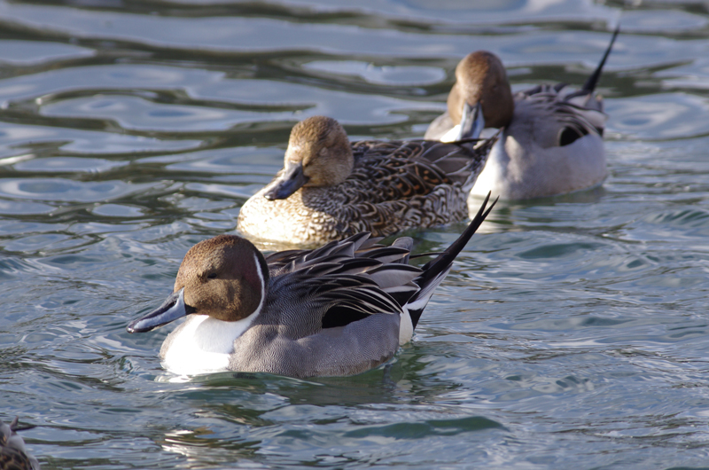 観察時期:秋冬春 観察場所:湖沼、河川 大きさ:カラスくらい 細く長い尾羽が斜め上にツンと立っているのが雄の特徴。 色合いがシックで美しいカモだと思います。3枚目の写真にいるメスは他のカモと同様に全体が褐色。 様々な水辺に数多くいます。あまり人を恐れないので気軽に観察できるカモです。 4枚目の写真は採餌シーンですが尾を立て逆立ちの姿勢で餌を食べます。水草や水生昆虫などを食べます。