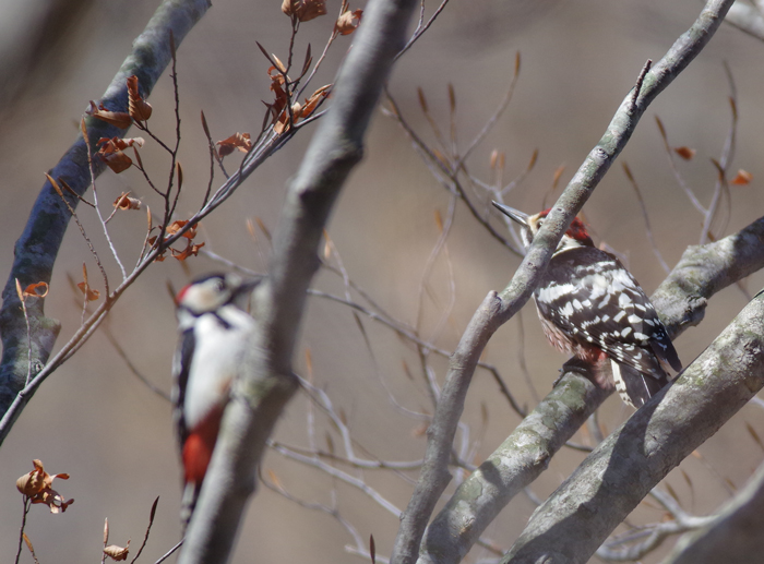 左のボケて写っている鳥がアカゲラで右がオオアカゲラです。 整理番号:070c 撮影日時: 撮影場所: