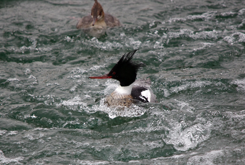 この激流の中でもウミアイサは潜って餌を探します。 泳ぎはとても上手です。