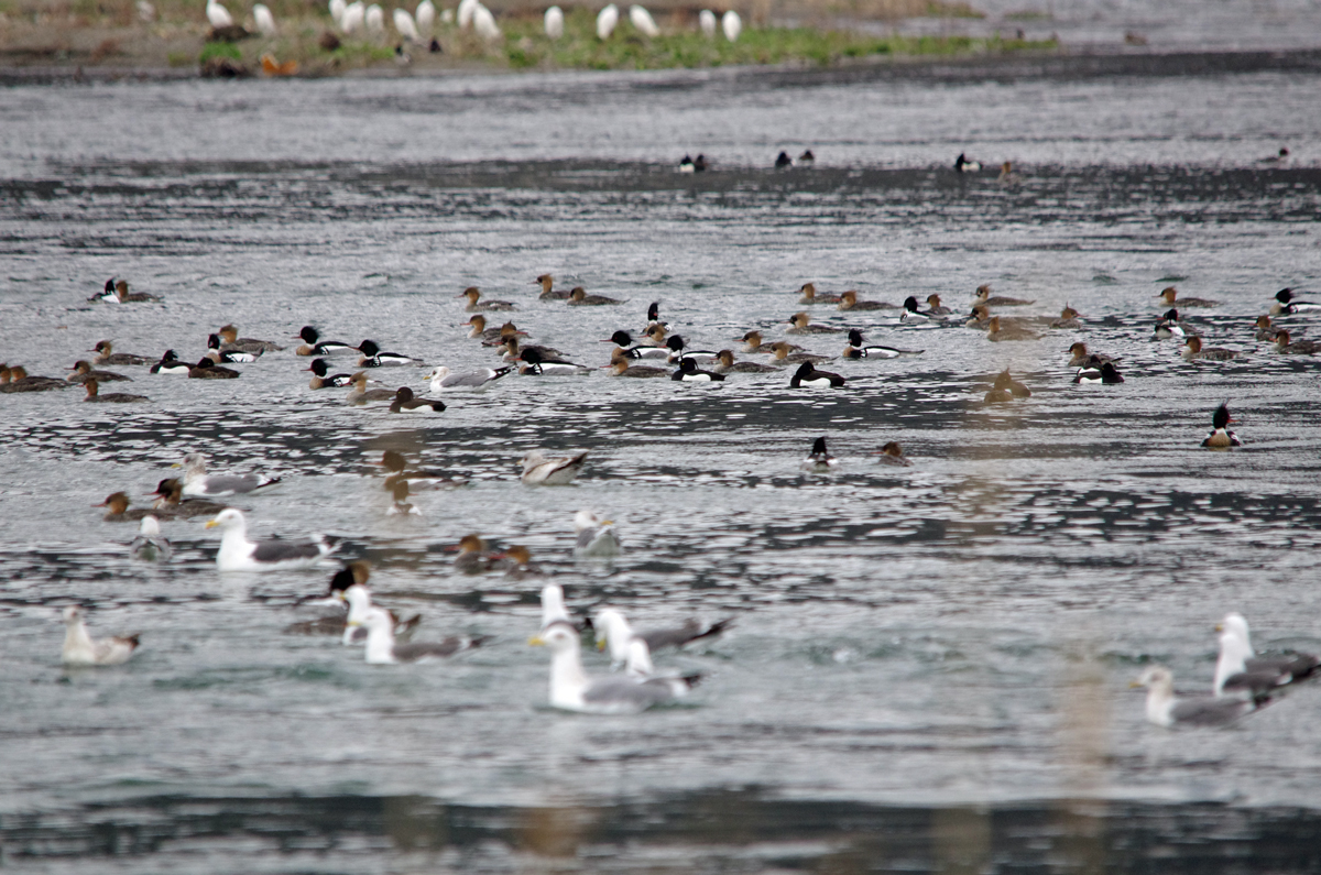いっぱい、います。ウミアイサが。 100羽以上はいますね。