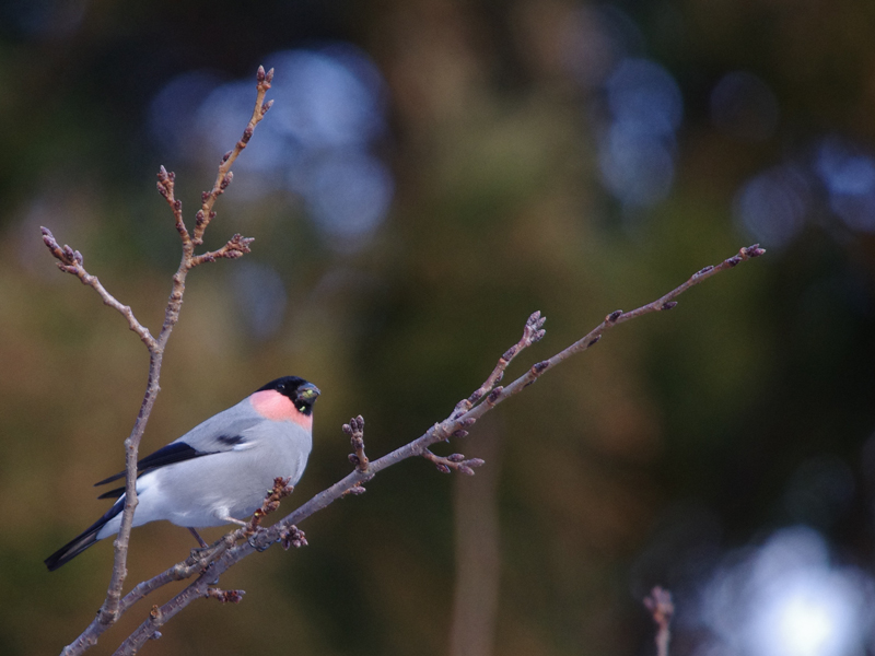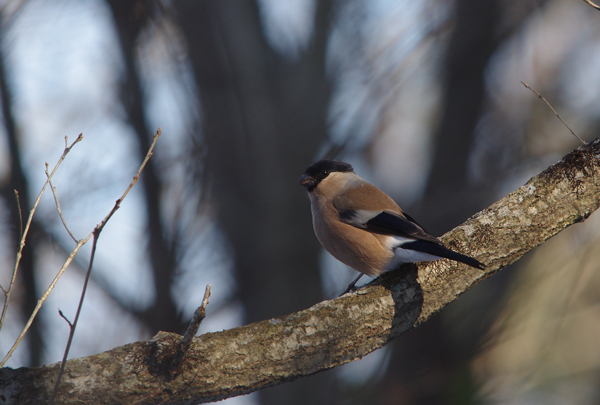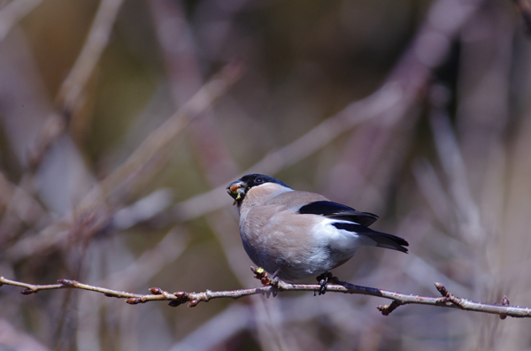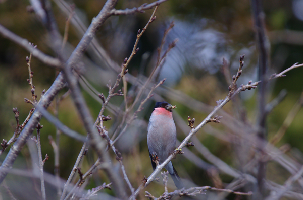 秋冬春 観察場所:林 大きさ:スズメくらい 鳴き声:フィー フィー(人の口笛に似ている) オスはのどが美しい紅色です。メスには、のどの紅色はありません。 頭部は雄雌とも黒で鳴き声が人間の口笛に似ているのでウソという名が付いたとのことです。 春には木の花芽を啄むので害鳥扱いされることもあります。ケセン地方には冬鳥として飛来します。